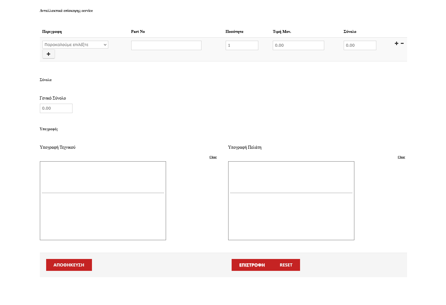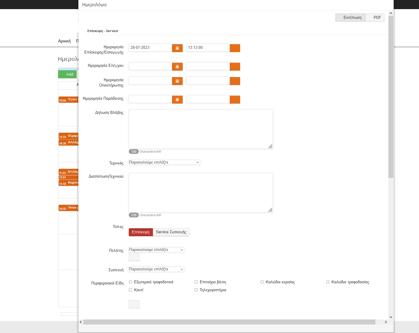 Εισαγωγή Επίσκεψης ή επιτόπιου servis με καταχώρηση ημερομηνιών εισαγωγής, ελέγχου, ολοκλήρωσης, παράδοσης, τεχνικού, εκτίμηση κόστους με εισαγωγή ανταλλακτικών και άλλων δεδομένων.